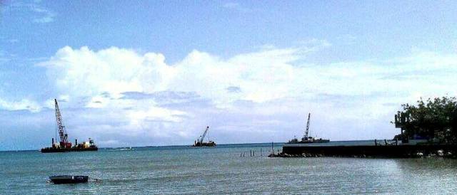 Las dragas-barcazas iniciaron sus labores con las extracción del fondo marino de toneladas de cieno y sedimentos con la finalidad de darle el calado (profundidad) requerida para los trasatlántico repletos de turistas que atracaran en la terminal que será construida en esa localidad.