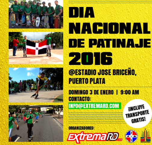 PUERTO PLATA.- ElMinisterio de Deportes y Recreación, en coordinación con la Asociación dePatinaje de Puerto Plata, celebrará el 3 de enero del 2016, el Día Nacional del Patinaje con un recorridopor la hermosa costa de Puerto Plata, donde se visitará el Malecón y el ParqueCentral o Plaza Independencia a partirde las 9:00 de la mañana, culminando en el Polideportivo General GregorioLuperón.