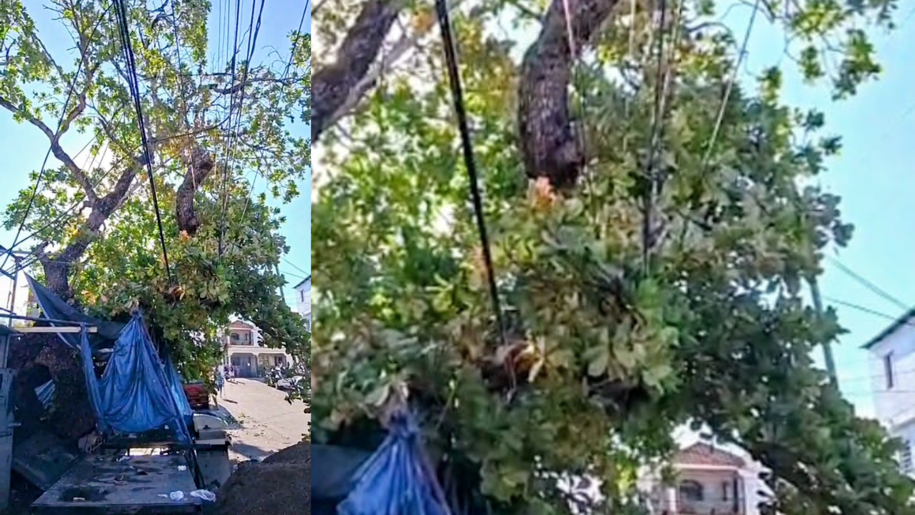 PUERTO PLATA.- Un inminente peligro representa un árbol de almendro caído encima del cableado eléctricos y telefónico en la calle Activo 20-30 del ensanche Miramar (Los Cocos) próximo a la escuela de Cambelén. Dicha situación ha sido denunciada por los residentes en ese perímetro quienes imploran del benemérito Cuerpo de Bomberos Municipales acudir al lugar antes de que ocurra una desgracia.