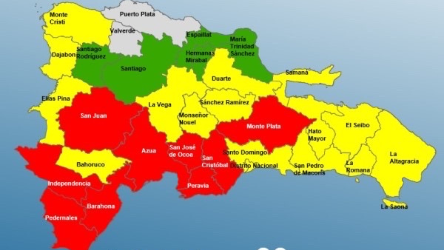 En alerta amarilla están: La Vega, Samaná, Hato Mayor, El Seibo, La Romana, Elías Piña, Duarte, Bahoruco, Monseñor Nouel, Sánchez Ramírez, Monte Cristi, Santo Domingo, San Pedro de Macorís, Distrito Nacional, Dajabón, La Altagracia.