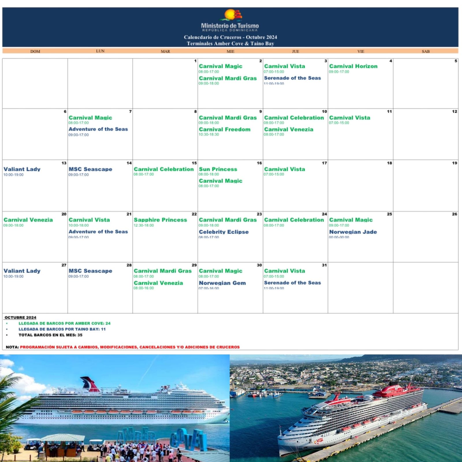 De los 35 cruceros, 24 atracarán en el puerto de Amber Cove, situado en el distrito de Maimón, mientras que los 11 restantes llegarán a la terminal Taíno Bay, ubicada en el centro de Puerto Plata.