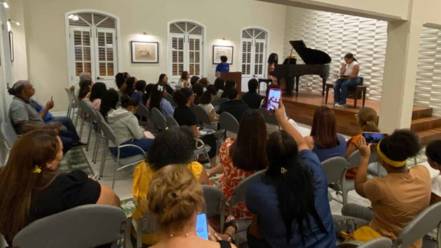 La apertura y ambientación musical estuvieron a cargo del Estudios de Piano María Ercilia Loynaz, bajo la dirección de Belkiss Grisanty Bournigal, cuyas interpretaciones acompañaron de manera magistral las lecturas poéticas, creando una atmósfera de sensibilidad y armonía durante toda la velada.